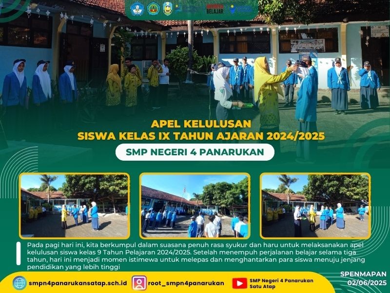 Pada pagi hari ini, kita berkumpul dalam suasana penuh rasa syukur dan haru untuk melaksanakan apel kelulusan siswa kelas 9 Tahun Pelajaran 2024/2025. Setelah menempuh perjalanan belajar selama tiga tahun, hari ini menjadi momen istimewa untuk melepas dan menghantarkan para siswa menuju jenjang pendidikan yang lebih tinggi