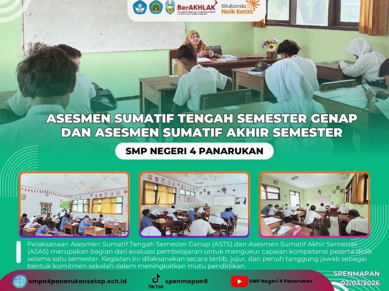 Pelaksanaan Asesmen Sumatif Tengah Semester Genap (ASTS) dan Asesmen Sumatif Akhir Semester (ASAS) merupakan bagian dari evaluasi pembelajaran untuk mengukur capaian kompetensi peserta didik selama satu semester. Kegiatan ini dilaksanakan secara tertib, jujur, dan penuh tanggung jawab sebagai bentuk komitmen sekolah dalam meningkatkan mutu pendidikan.