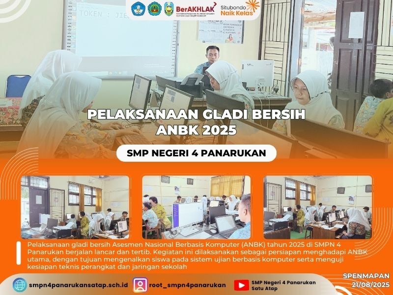 Pelaksanaan gladi bersih Asesmen Nasional Berbasis Komputer (ANBK) tahun 2025 di SMPN 4 Panarukan berjalan lancar dan tertib. Kegiatan ini dilaksanakan sebagai persiapan menghadapi ANBK utama, dengan tujuan mengenalkan siswa pada sistem ujian berbasis komputer serta menguji kesiapan teknis perangkat dan jaringan sekolah.