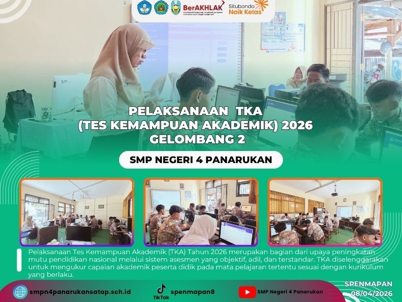 Pelaksanaan Tes Kemampuan Akademik (TKA) 2026 Gelombang 2 hari pertama berjalan dengan lancar, tertib, dan kondusif. Seluruh peserta hadir tepat waktu dan mengikuti ujian dengan penuh kesungguhan. Panitia serta pengawas melaksanakan tugas dengan baik sesuai prosedur yang telah ditetapkan, sehingga kegiatan dapat berlangsung tanpa kendala yang berarti. Diharapkan kelancaran ini dapat terus terjaga hingga hari-hari berikutnya