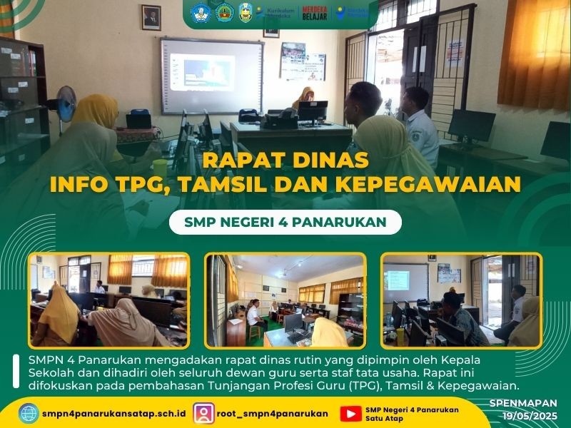 SMPN 4 Panarukan mengadakan rapat dinas rutin yang dipimpin oleh Kepala Sekolah dan dihadiri oleh seluruh dewan guru serta staf tata usaha. Rapat ini difokuskan pada pembahasan Tunjangan Profesi Guru (TPG), Tamsil & Kepegawaian.