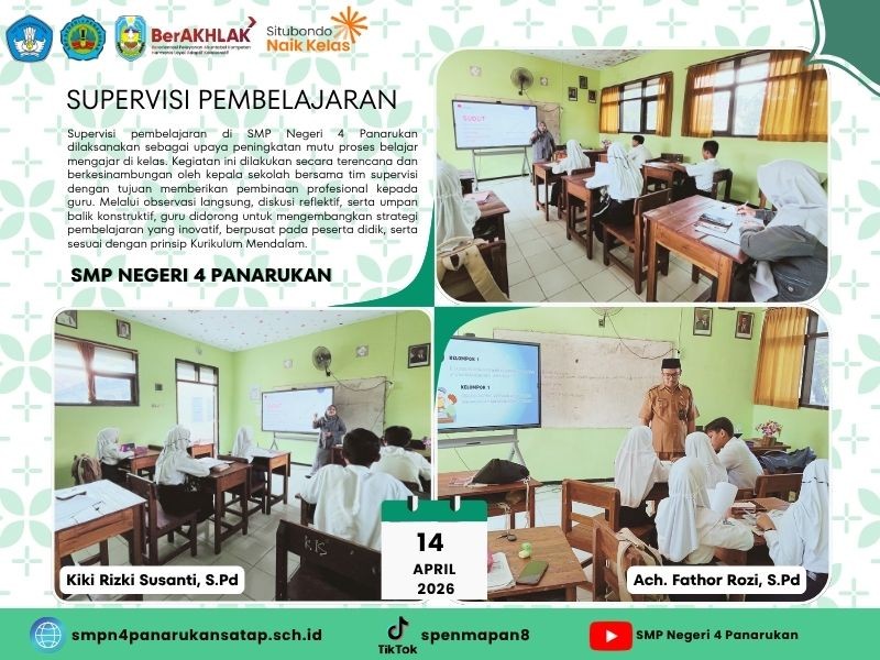 Supervisi pembelajaran di SMP Negeri 4 Panarukan dilaksanakan sebagai upaya peningkatan mutu proses belajar mengajar di kelas. Kegiatan ini dilakukan secara terencana dan berkesinambungan oleh kepala sekolah bersama tim supervisi dengan tujuan memberikan pembinaan profesional kepada guru. Melalui observasi langsung, diskusi reflektif, serta umpan balik konstruktif, guru didorong untuk mengembangkan strategi pembelajaran yang inovatif, berpusat pada peserta didik, serta sesuai dengan prinsip Kurikulum Mendalam. Hasil supervisi menunjukkan adanya peningkatan dalam perencanaan pembelajaran, pelaksanaan kegiatan belajar, serta penggunaan media dan asesmen yang lebih variatif. Dengan demikian, supervisi pembelajaran menjadi sarana efektif dalam meningkatkan kompetensi guru dan kualitas pendidikan di SMP Negeri 4 Panarukan.