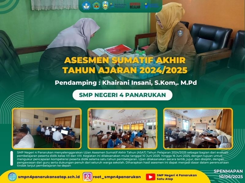 SMP Negeri 4 Panarukan menyelenggarakan Ujian Asesmen Sumatif Akhir Tahun (ASAT) Tahun Pelajaran 2024/2025 sebagai bagian dari evaluasi pembelajaran peserta didik kelas VII dan VIII. Kegiatan ini dilaksanakan mulai tanggal 10 Juni 2025 hingga 16 Juni 2025, dengan tujuan untuk mengukur pencapaian kompetensi peserta didik selama satu tahun pembelajaran. Ujian dilaksanakan secara tertib, jujur, dan disiplin, dengan pengawasan dari guru serta dukungan penuh dari seluruh warga sekolah. Diharapkan hasil asesmen ini dapat menjadi dasar dalam perencanaan tindak lanjut pembelajaran ke depan