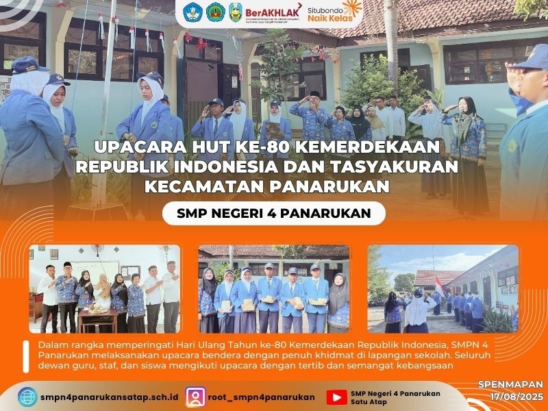 Dalam rangka memperingati Hari Ulang Tahun ke-80 Kemerdekaan Republik Indonesia, SMPN 4 Panarukan melaksanakan upacara bendera dengan penuh khidmat di lapangan sekolah. Seluruh dewan guru, staf, dan siswa mengikuti upacara dengan tertib dan semangat kebangsaan.